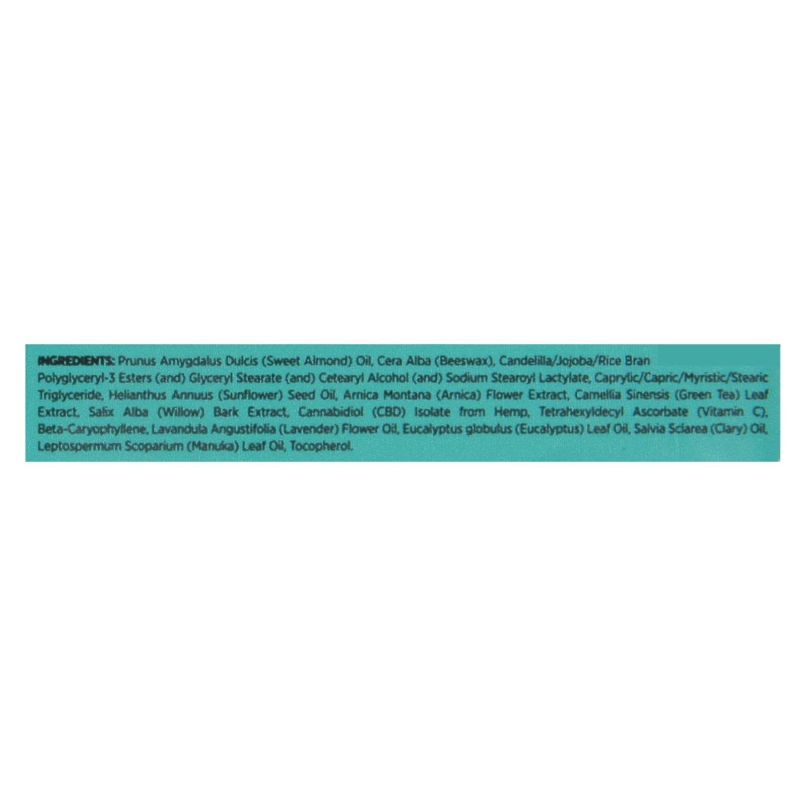 ingredients : prunus amygdalus dulcis (sweet almond) oil;cera alba (beeswax);candelilla/jojoba/rice bran polyglyceryl-3 esters (and) glyceryl stearate (and) cetearyl alcohol (and) sodium stearoyl lactylate;caprylic/capric/myristic/stearic triglyceride;helianthus annuus (sunflower) seed oil;arnica montana (arnica) flower extract;camellia sinensis (green tea) leaf extract;salix alba (willow) bark extract;cannabidiol (cbd) isolate from hemp;tetrahexyldecyl ascorbate (vitamin c);beta-caryophyllene;lavandula angus
