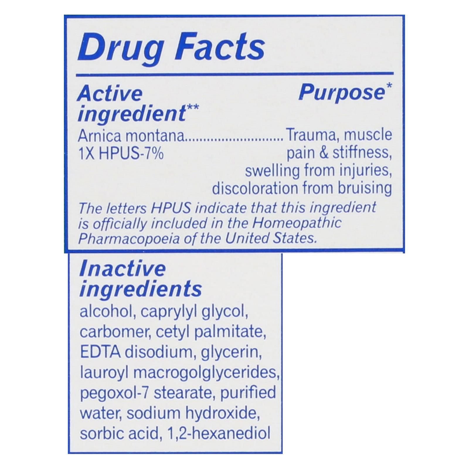ingredients : active ingredient** purpose* arnica montana 1x hpus-7% trauma;muscle pain & stiffness;swelling from injuries;discoloration from bruising inactive alcohol;caprylyl glycol;carbomer;cetyl palmitate;edta disodium;glycerin;lauroyl macrogolglycerides;pegoxol-7 stearate;purified water;sodium hydroxide;sorbic acid;1;2-hexanediol