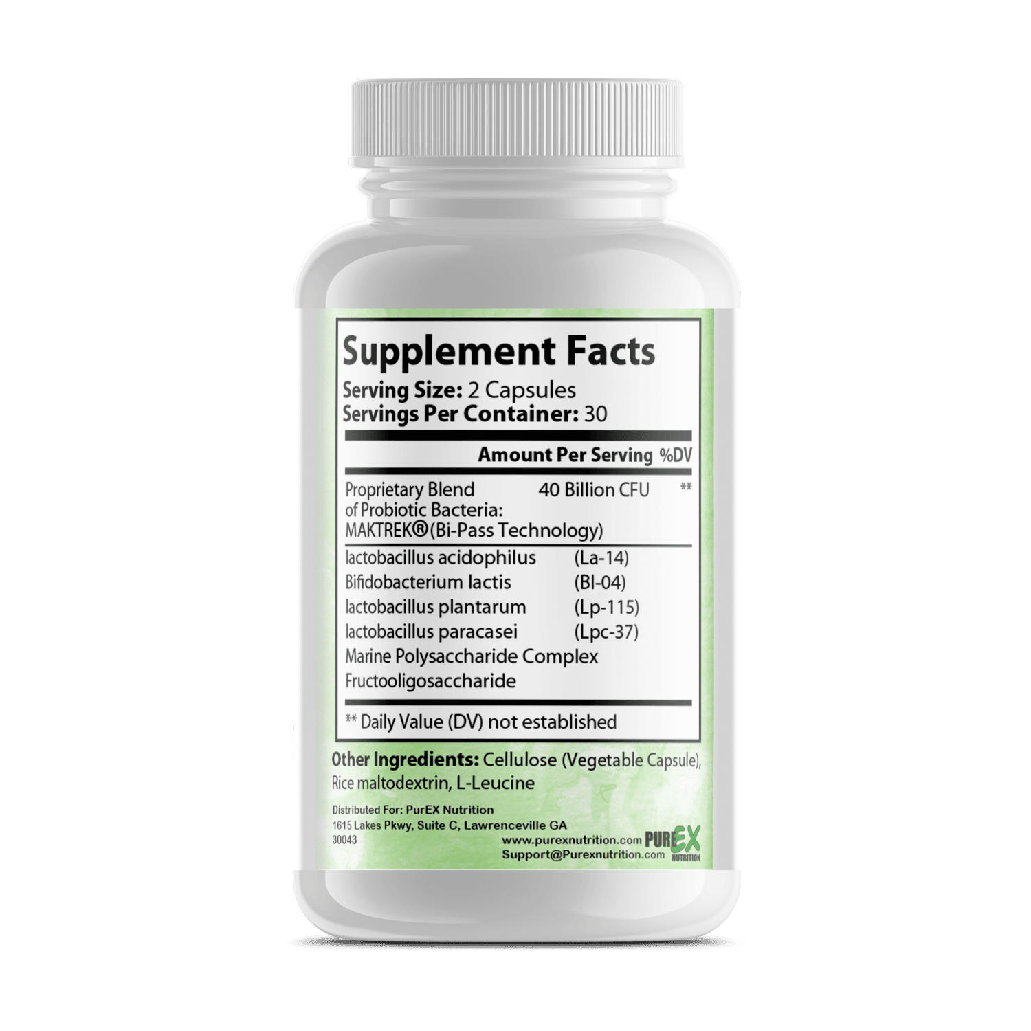 Pure Probiotics contain 40 billion units of colony forming units(CFU) to help improve or balance your microbiota. With MAKTrek® Bi-Pass Technology Pure Probiotics is formulated for a higher level of absorption. MAKTrek® Bi-Pass Technology is a patented formula that helps to improve the absorption of probiotics specifically within the body. MAKTrek® works by protecting the capsule with a protective layer keeping it safe in the stomach. This is so that it isnt broken down early by digestive enzymes in the stomach or intestines.