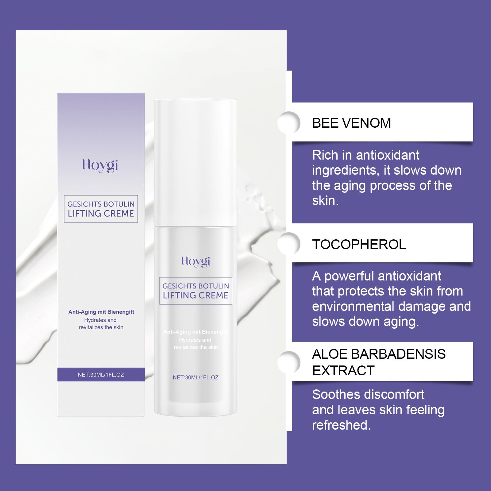 Our moisturizer contains triethanolamine, collagen and bee venom. It can provide antioxidant effects by tocopherol (vitamin E), fighting free radical damage and delaying aging. Highly effective formula helps skin and dryness. Its application is simple: with clean fingers, apply the appropriate amount to the head, cheeks, nose and chin. Massage gently with your fingertips for a few minutes to absorption. Please clean your face before use to ensure clean skin. And can be rich in nutrients, deep into the skin, providing powerful nutrients to help skin problems caused by aging.